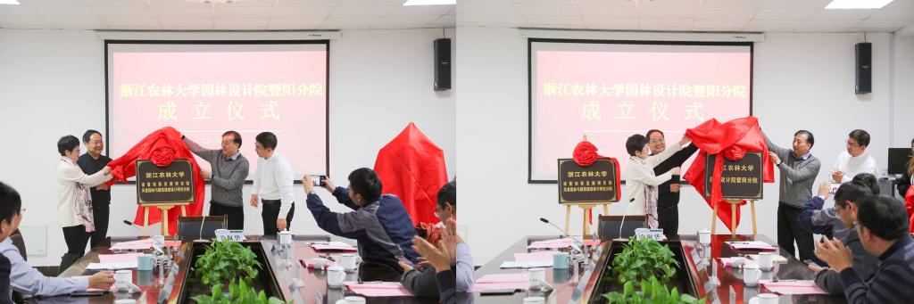 金佩华、石道金、陈小华、李文莉为暨阳分院揭牌。石道金宣读暨阳分院成立文件、暨阳分院理事会组成人员任命文件,陈小华宣读了暨阳分院院长、常务副院长任命文件。校园林设计院负责人介绍了园林设计院有关情况,并与学院、暨阳分院分别签订合作协议和目标责任书。暨阳分院负责人、学院园林学院负责人分别做表态发言。