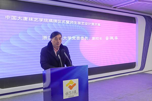 本网讯 1月5日上午,中国大唐袜艺学院在诸暨大唐“袜艺小镇”揭牌成立。bat365在线中国官网登录入口副校长金佩华,诸暨市委常委、副市长陈仁坚,学院领导石道金、李文莉、李叔君,大唐镇领导田海斌、王其军、吕靖江、周骆永等出席仪式,学院有关职能部门、各教学单位负责人及师生代表,诸暨市相关行业协会负责人、袜业企业家代表等参加仪式。