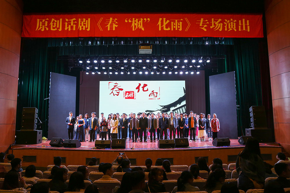 4月26日晚,在五四运动100周年即将到来之际,由我院师生自编自导自演的思政舞台剧《春“枫”化雨》在东湖校区影剧院首演。校党委副书记冯尚申,副校长金佩华,校党委委员、宣传部部长胡祖吉,各部门、学院负责人,师生代表近千人观看了演出。