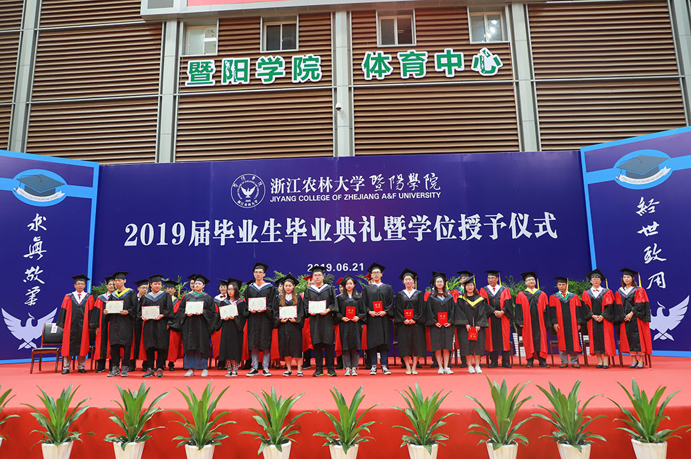 副院长李叔君宣读了浙江省教育厅和学院关于表彰2019届优秀毕业生的决定。主席台就座领导和学位评定委员会委员为优秀毕业生代表颁发荣誉奖杯。