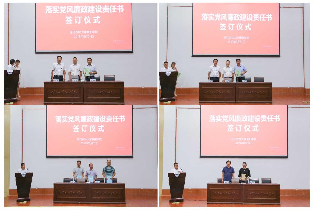 徐爱俊、潘国忠与分管院领导签订了2019年党风廉政建设责任书。分管院领导与职能部门、二级学院(部、中心)代表签订了2019年党风廉政建设责任书。