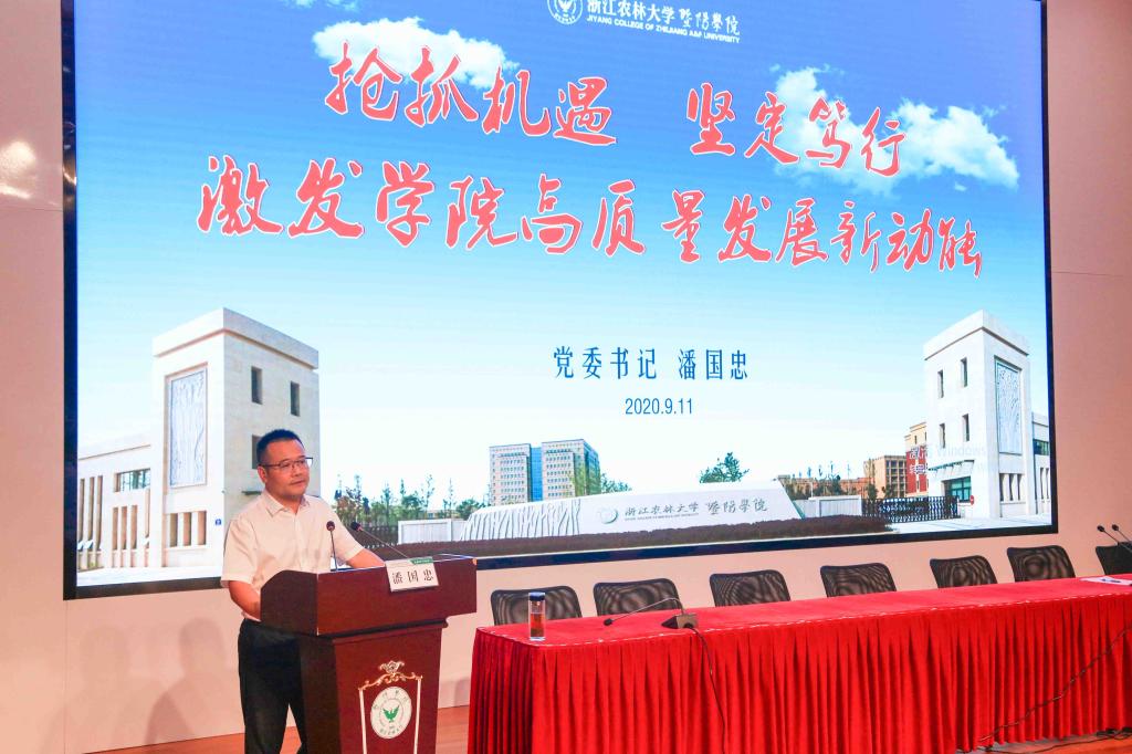 潘国忠指出,2020年是“十三五”规划收官之年,也是“十四五”规划的谋划之年,更是学院面临第二次创业的关键之年,我们要在这“百年未有之大变局和中华民族伟大复兴的战略全局”背景下,深刻领会习近平总书记赋予浙江“重要窗口”建设和国家、省高等教育强省战略的新目标新定位新要求,深刻分析学院高质量发展面临的机遇和挑战。他表示,推进学院高质量发展,要以办学初心为引领,审视发展过程中存在的短板和问题,认清形势,抢抓机遇,明确方向,坚定笃行,在大变局下求得新突破,在新起点上开启新征程。他强调,一是要解放思想,开拓创新,重新审视学院办学定位、办学特色、办学目标,以新的思路、新的理念和世界眼光、战略思维来审视、谋划和推动工作。二是要深入分析短板,明确目标举措,要优化办学物质基础,既要扩大办学条件又要提高现有资源的利用率;要提升治理体系和治理能力建设,加快信息化建设进程;要以人才培养为核心,强化师资队伍建设,提升社会服务水平;要凝练暨阳特有的校园精神文化,为学院发展提供动力源泉;三是要不断加强干部队伍建设,提升教育情,发扬暨阳情,培养大局观,担当新作为,发挥出闯劲、钻劲、韧劲、拼劲,加快推进学院高质量发展。