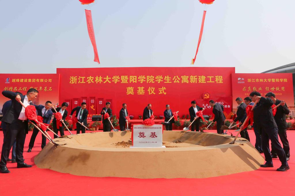 伴随着绽放的礼花,全场掌声雷动,出席仪式的领导和嘉宾一起为学生公寓新建工程培土奠基。