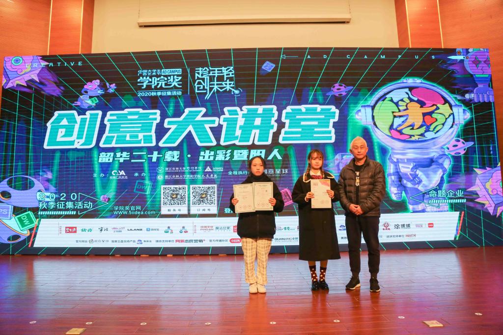 广告人文化集团副总裁李建强先生为我院颁发了年度广告教育推动奖,以表彰学院在该项赛事中取得的突出成绩,做出的卓越贡献;为我院广告学专业19级章梦秋同学颁发RIO 企业奖银奖,19级赵乐维同学颁发公益类铜奖。