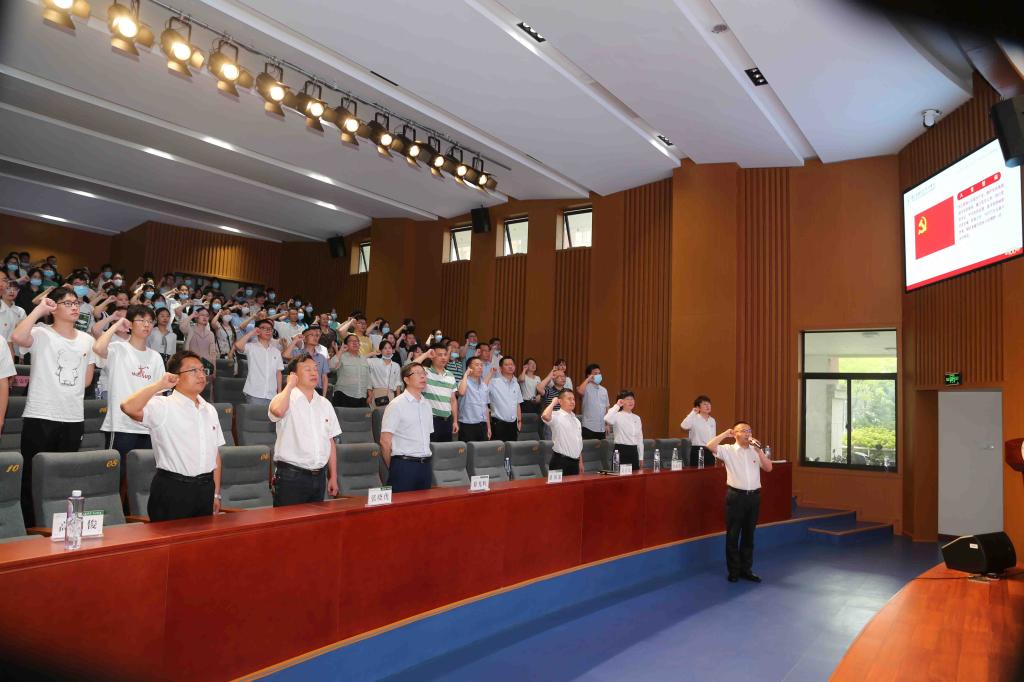 教师党员代表周琼、学生党员代表王舒影在大会上分别发言。随后,新发展师生党员在潘国忠的领誓下进行入党宣誓。