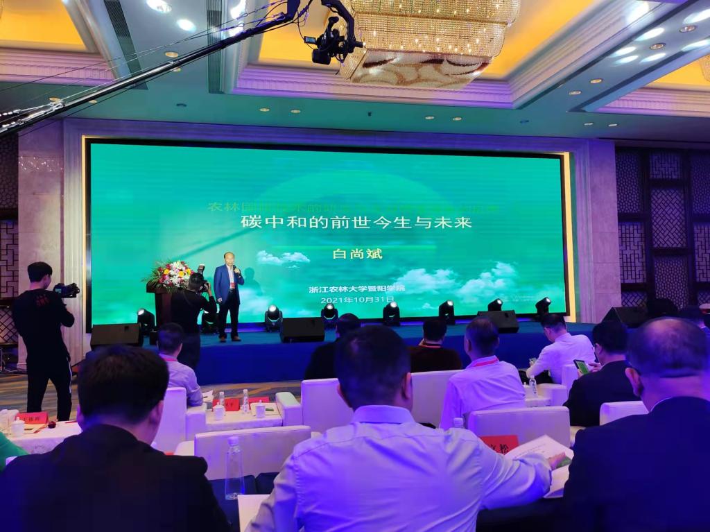 白尚斌教授在论坛上作了题为《碳中和的前世今生与未来》的报告。他代表学院与中国国际经济技术合作促进会等十余家机构或单位领导一道上台参加联合倡议发起中国国际新能源车碳达峰碳中和高峰论坛永久举办地项目启动仪式。