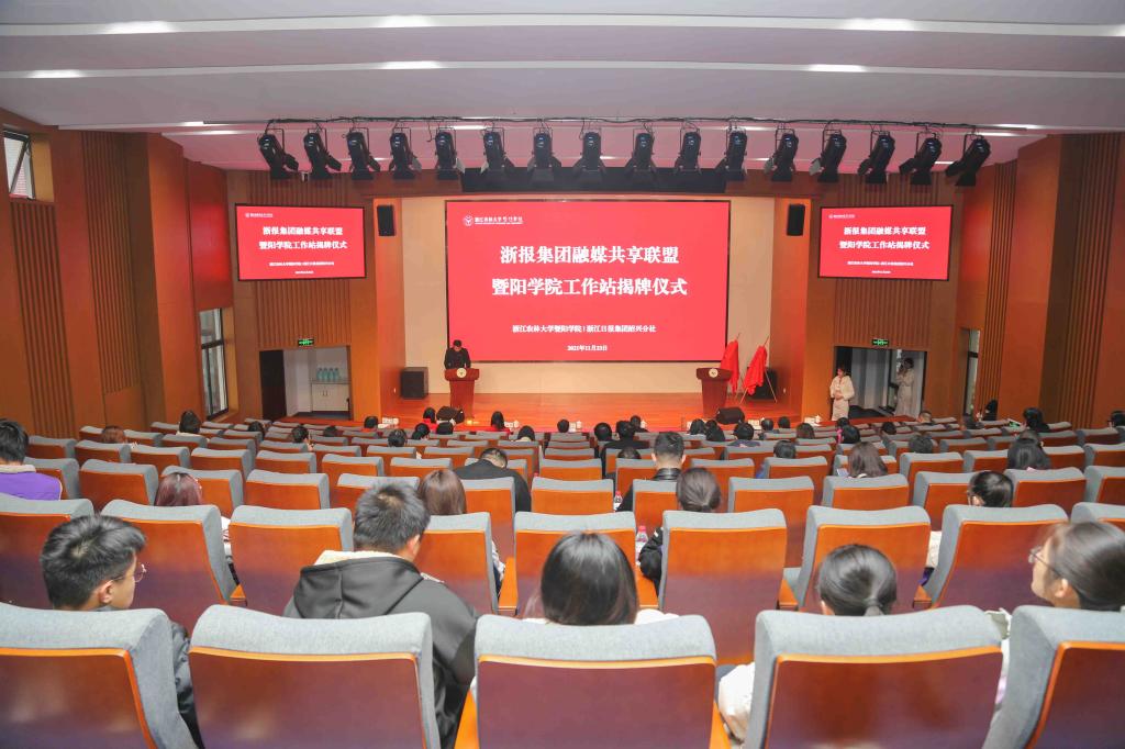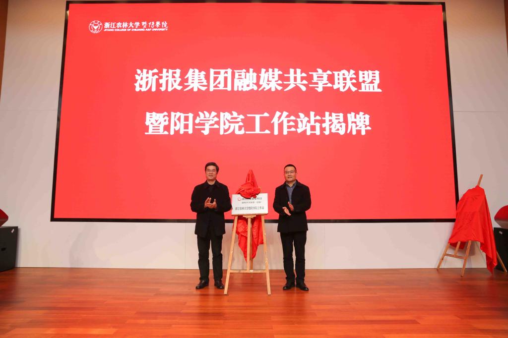 11月23日,浙报集团融媒共享联盟bat365在线中国官网登录入口工作站揭牌仪式在我院举行。学院党委书记潘国忠、党委副书记高国俊,浙报集团绍兴分社总监周智敏、采编中心主任苗丽娜出席仪式。仪式由学院办公室负责人主持。