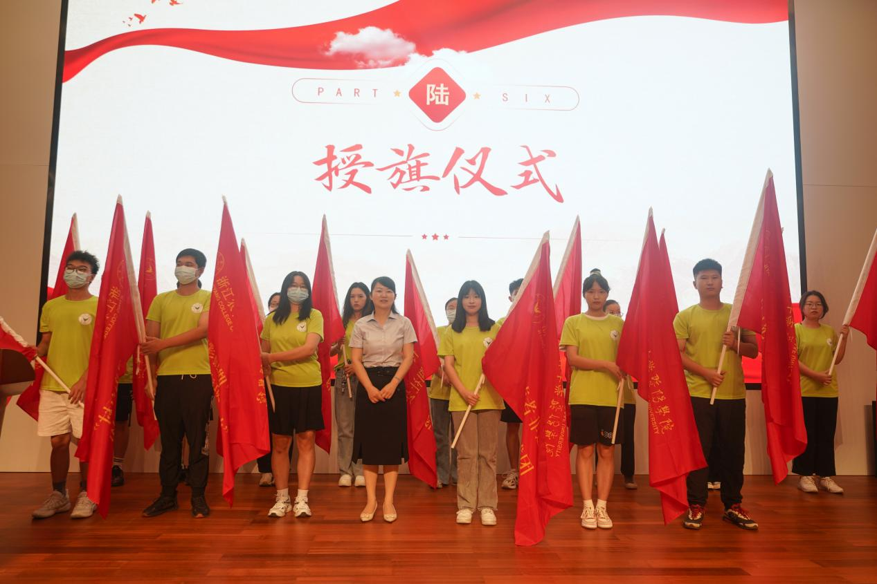 出征仪式上,洪昀为2022年bat365在线中国官网登录入口大学生暑期社会实践重点立项团队代表授旗。