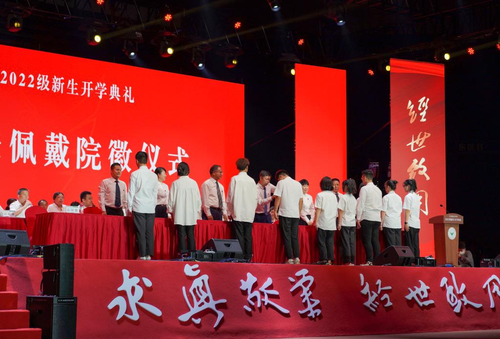 典礼上,主席台前排就坐的领导为新生代表佩戴象征着暨阳人使命与光荣的院徽。