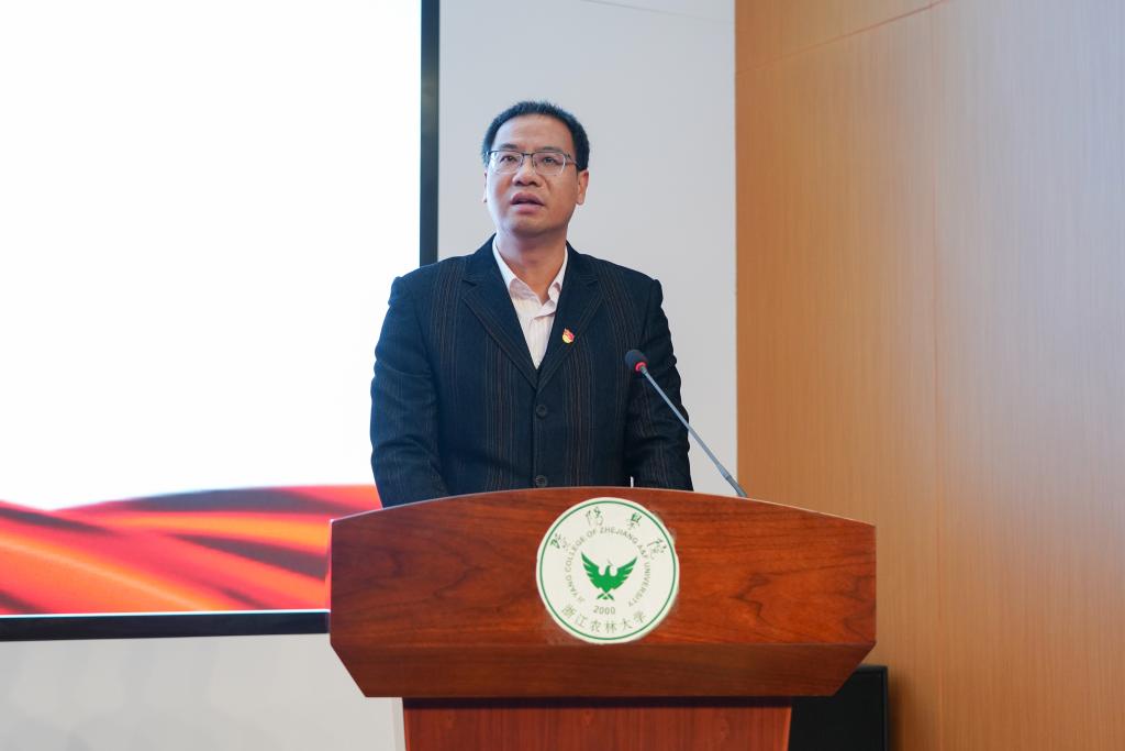 11月17日下午,学院隆重举行“党旗领航 镇银联校”兴村共富党建共同体签约启动仪式。仪式由学院党委、学校经管学院党委、应店街镇党委、中国银行诸暨支行党总支四方共同发起,由商学院党总支承办。学院党委书记洪昀、学校经管学院党委书记周凯、应店街镇党委副书记杨岚、中行诸暨支行党总支书记杜钧出席仪式并致辞。仪式由学院党委副书记李文莉主持。
