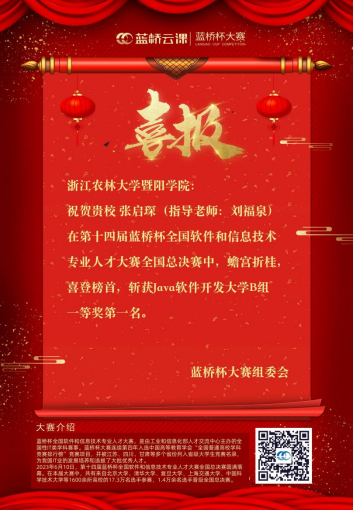 近日,第十四届蓝桥杯全国软件和信息技术专业人才大赛全国总决赛成绩公布,由bat365在线中国官网登录入口工程技术学院刘福泉老师指导的张启琛、朱新捷、姜梓堉三位同学荣获总决赛一等奖。蓝桥杯大赛组委会特地发来喜报,祝贺张启琛同学斩获Java软件开发大学B组一等奖第一名。