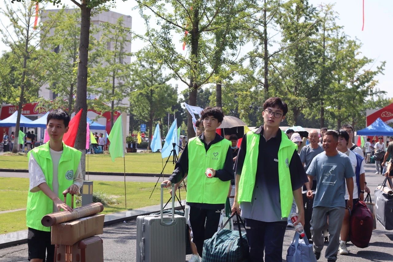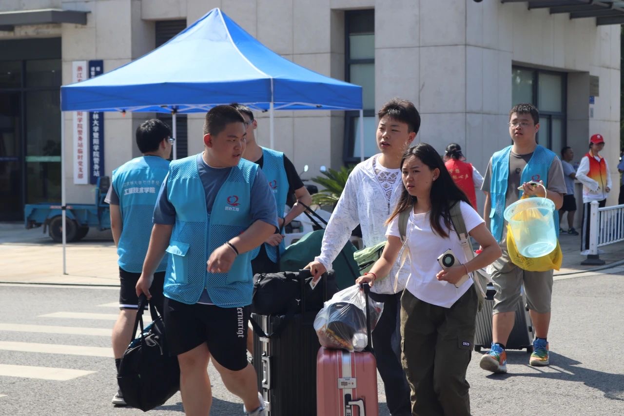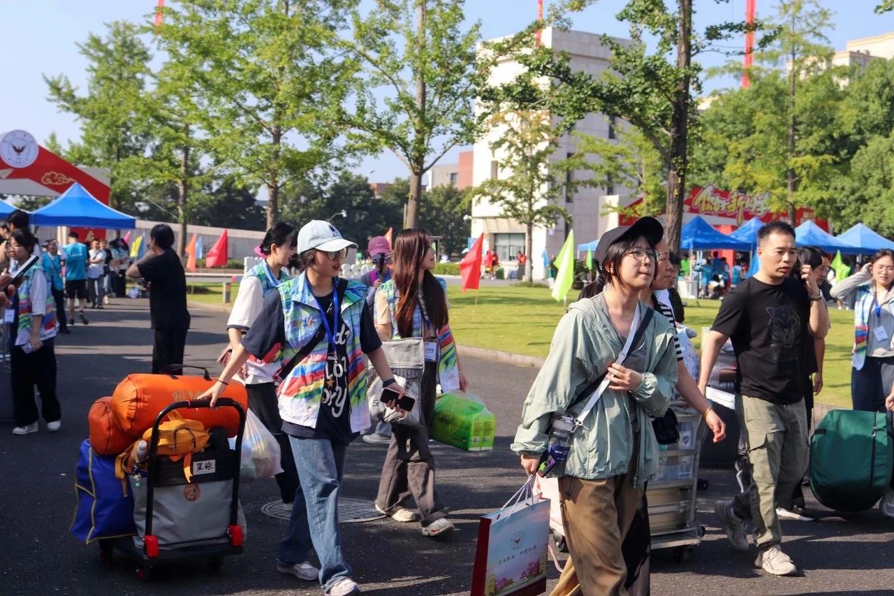 朝阳初升,迎新工作如火如荼地开展。新生在志愿者的引领下走进暨阳大门,满目可见张贴在各处的迎新标语。银杏大道上,满载着新生与行李的接驳车不断往返,志愿者热情地带领新生办理入学手续、安置行李。