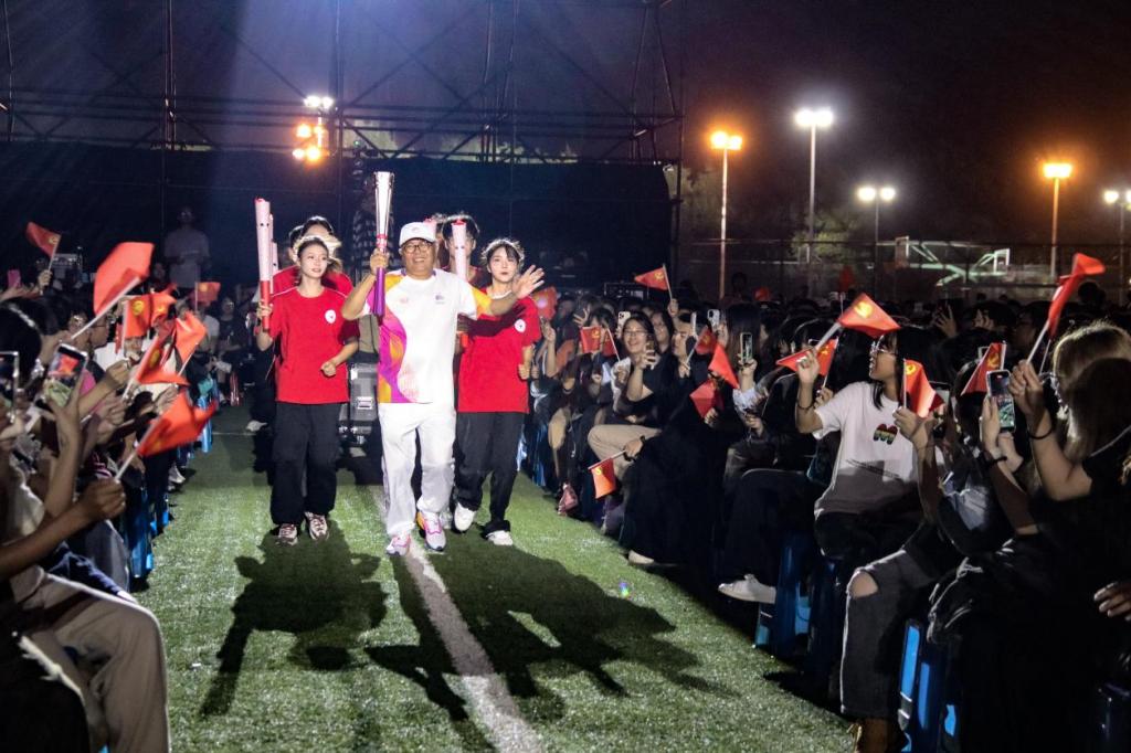 晨晓高举火炬,带领着6名暨阳学子从足球场缓缓跑来,一场“薪火”传递,从亚运赛场延伸到了校园,亚运精神,也深深根植到了每一位暨阳学子心中。