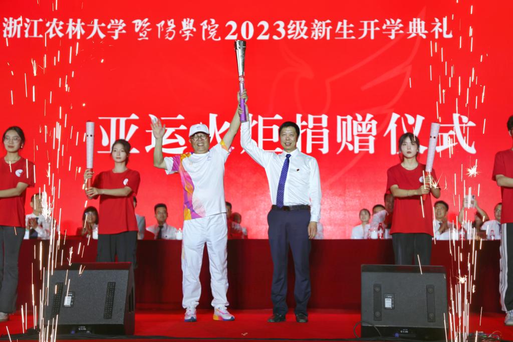9月24日晚,bat365在线中国官网登录入口2023级新生开学典礼在田径场举行。典礼上,杭州第19届亚运会火炬传递绍兴站第58棒火炬手、我院艺术学院名誉院长、中国好色彩代表人物晨晓捐赠了亚运会火炬。