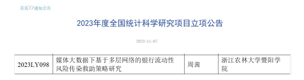 11月7日,经国家统计局全国统计科学研究组织管理办公室评审,由bat365在线中国官网登录入口商学院副教授、绍兴市鉴湖青年社科学者周茜博士牵头申报的2023年度全国统计科学研究项目正式获批立项(项目编号:2023LY098)。该项目是基于大数据进行的农村商业银行流动性风险溢出与控制模型的应用研究。这是本年度全国唯一一所独立学院获批全国统计科学研究项目,也是学院首次获批,实现了我院在全国统计科学研究项目立项上零的突破。