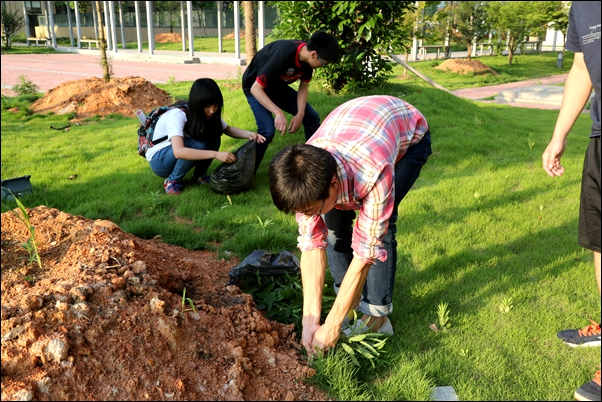 当天下午5:30,参加除草活动的同学们分成6个作业小组,来到各自的任务区域开始各自的工作。没有开始的口号,只有无声的行动;没有路人的赞赏,只有内心满溢的幸福。在现场,同学们积极劳动,人人争先,个个向前,发扬不怕苦、不怕脏、不怕累的精神。男生主动承担起脏活、累活、重活,女生们也不甘示弱,纷纷弯腰下蹲,开始了紧张辛苦的杂草清除。整场活动分工协作,有条不紊,处处呈现出一派热火朝天的劳动景象。尽管泥土弄脏了衣服和鞋子,蚊虫叮咬着大家的身体,汗水浸湿了衣背,但近400名“90后”同学全然不顾,专心致力于杂草清除工作,整个活动持续近1个半小时,直到华灯初上才纷纷离开作业区域。