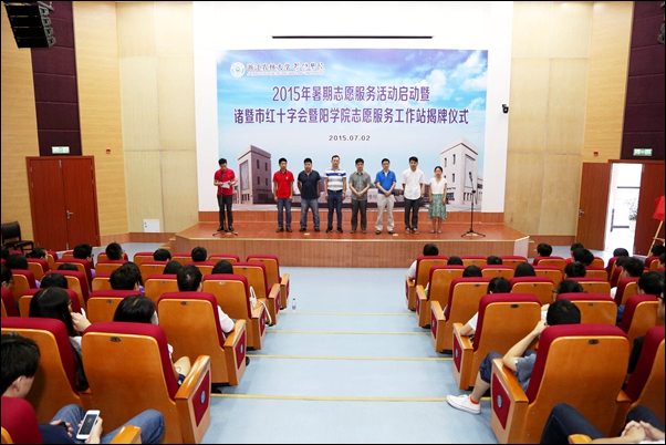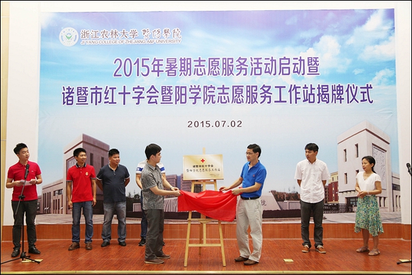 仪式上,办公室负责人和诸暨市红十字会执委会副主任共同为诸暨市红十字会bat365在线中国官网登录入口“志愿服务工作站”揭牌;学工部、团委相关负责人宣读了2015年暑期社会实践立项团队名单,并作了安全培训。