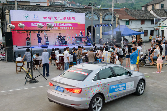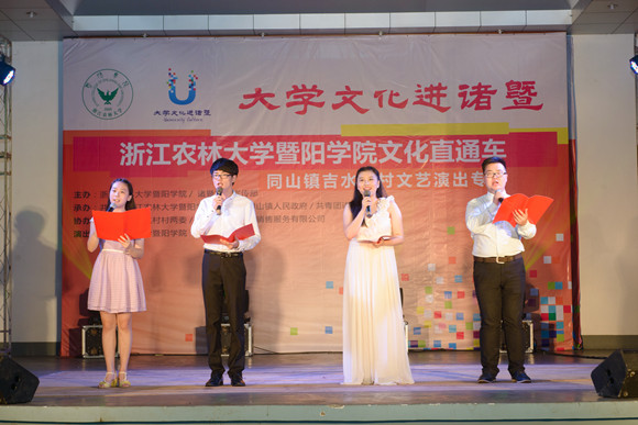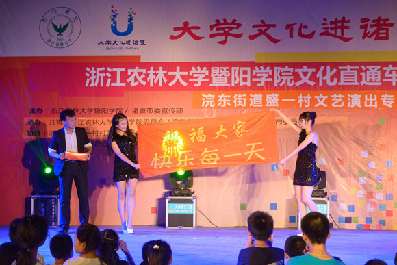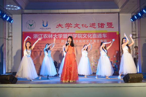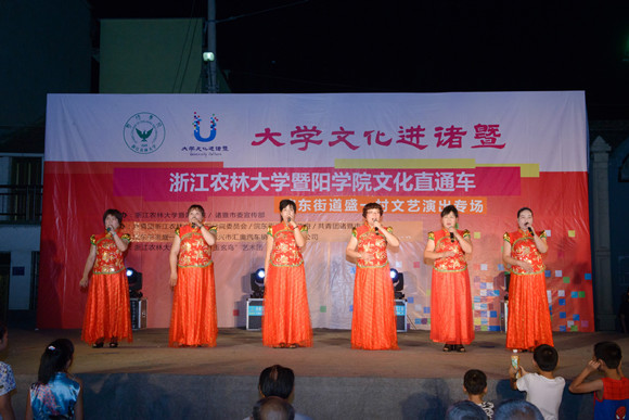 本网讯 让诸暨人民看到暨阳学子活力身影、听到暨阳学子嘹亮声音,7月3日、4日、5日、8日、9日和13日,作为我院大学文化进诸暨“五个一工程”之一的“文化直通车”先后开进诸暨市璜山镇姚王村、安华镇新一村、街亭镇花厅村、浬浦镇盘山村、同山镇吉水坑村以及浣东街道盛一村,5000余名当地干部群众在家门口欣赏到了我院大学生送上的一道道文化盛宴。