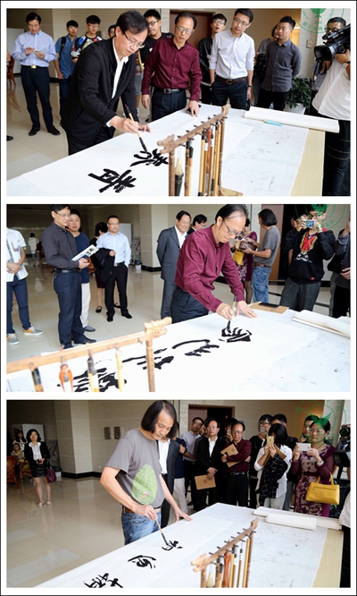 开幕式结束后,出席活动的领导、嘉宾和现场师生一起参观展览作品。书法家黄建新、汪士华、许绍满现场挥毫泼墨,笔墨饱蘸激情,笔韵行云流水,展示了精湛的创造技艺,赢得了大家热烈的掌声和叫好声。