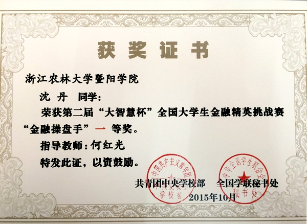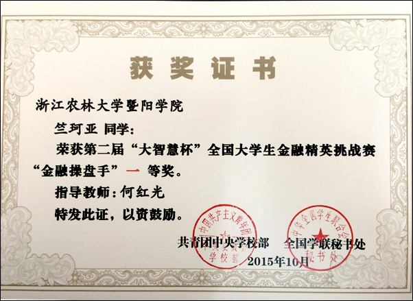近日,由共青团中央学校部、全国学联秘书处联合举办的第二届“大智慧杯”全国大学生金融精英挑战赛落下帷幕。我院参赛学生在比赛中表现突出,其中2人获得一等奖、5人获得三等奖。我院教师何红光、张付安荣获“优秀领队奖”。