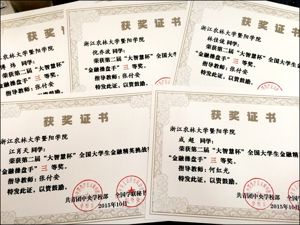本届大赛从3月9日正式开始报名,学院高度重视,在关注学生备赛的同时协调经济管理系相关专业教师对参赛学生进行赛前指导和竞赛培训等。通过宣传推广和积极组织学生报名,共有300余名学生参与其中。通过带队老师的悉心指导,我院学生在比赛中充分运用专业知识,在大赛指定交易平台进行A股、港股、股指期货三个交易品种的投资策略比拼。经过激烈角逐,最终我院7名学生进入复赛,并在比赛中发挥出色,取得了优异成绩:经济管理系竺珂亚、沈丹荣获全国一等奖;经济管理系成超、江肖天,工程技术系林佳俊、倪乔波、傅炜荣等5位同学荣获全国三等奖。