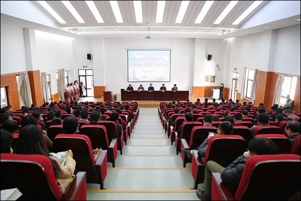 本网讯 3月4日下午,学院召开全体教职工大会,表彰上年度先进单位和个人,传达学校中层干部会议主要精神,总结2015年工作,部署2016年任务,进一步统一认识,明确目标,凝心聚力共谋学院未来发展。院长石道金,党委书记寿韬,副院长修树东、张晓优出席大会。大会由副院长李文莉主持。