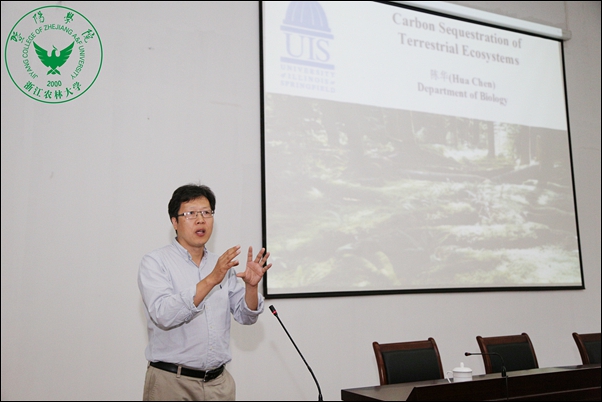 仪式结束后,陈华教授为师生们作了题为“Carbon Sequestration of Terrestrial Ecosystems”的学术报告,介绍了他的研究项目和研究内容,并积极鼓励广大教师和学生共同参与学术研究。