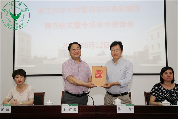 本网讯 6月12日下午,陈华博士聘任仪式暨专场学术报告会在人文4110举行。学院院长、bat365在线中国官网登录入口诸暨创新发展研究院院长石道金,副院长李文莉,bat365在线中国官网登录入口诸暨创新发展研究院副院长姚文斌,诸暨市委组织部副部长朱玉荣出席聘任仪式。