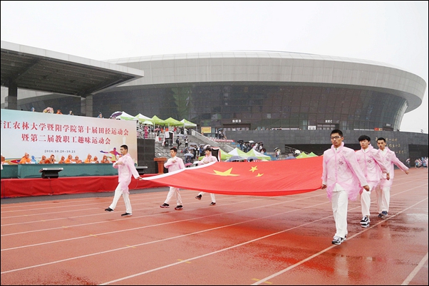 伴随着激昂的运动员进行曲,国旗方队,院旗、会徽方队,花束方队,彩旗方队以及运动员方队在开幕式上接受检阅。细雨绵绵,运动健儿风采依旧,他们队伍整齐、步伐矫健、口号嘹亮,以别出心裁的设计、青春焕发的活力,展示了暨阳学子蓬勃向上、奋发有为的精神面貌,博得现场观众的阵阵掌声。