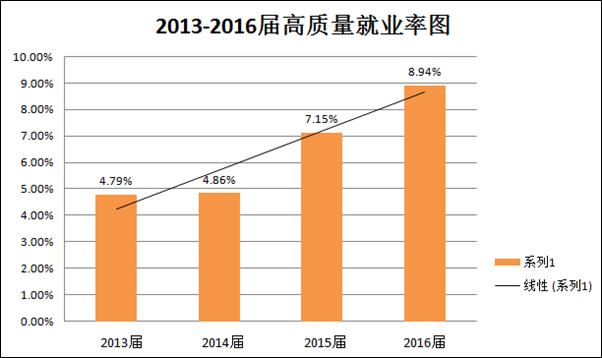 学院高度重视人才培养工作,始终秉承“以生为本,质量为先”的就业工作理念,逐步形成“学院统一领导、部门统筹协调、教师积极参与、学生踊跃参加”的就业工作格局,完善上下联动、协同一体、精简高效的运行机制,实现招生—培养—就业良性互动。2013年以来,学院就业率保持优良势头,升学率、创业率、高质量就业率呈稳步上升趋势。