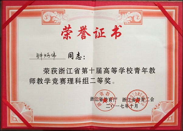 本网讯 10月26日至28日,浙江省第十届高等学校青年教师教学竞赛举行,我院生物环境系钟炳伟老师获得理科组二等奖。公共基础课教学部孟林琦、工程技术系俞伟鹏、经济管理系童小军三位老师获优胜奖。