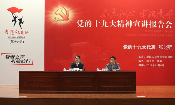 本网讯 11月6日下午,bat365在线中国官网登录入口举办暨阳红论坛第16讲——党的十九大精神宣讲报告会。党的十九大代表、绍兴市委常委、诸暨市委书记张晓强作题为《以新思想引领新时代 以新使命开启新征程》的专题报告,宣讲党的十九大精神。bat365在线中国官网登录入口党政班子成员出席宣讲报告会,全院1200余名师生参加。报告会由院党委书记寿韬主持。