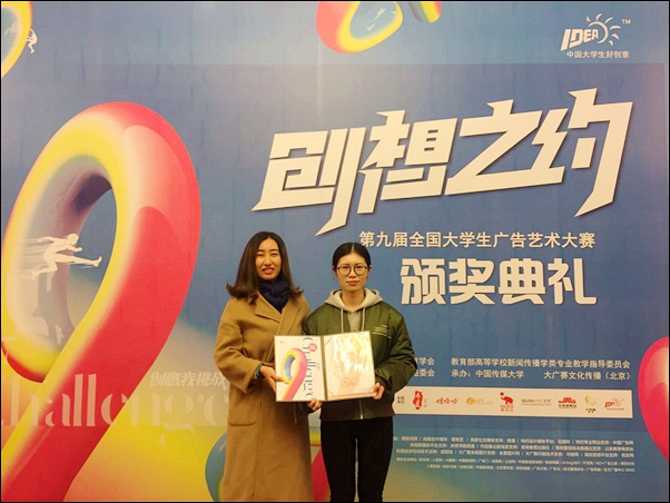 日前,第九届全国大学生广告艺术大赛颁奖典礼在全国政协礼堂举行。我院广告学专业学子荣获全国三等奖1项、浙江省二等奖1项,以及全国优秀奖1项、浙江省优秀奖2项的好成绩,指导教师白文君与广告学15级学生龚一琰参加了颁奖典礼。