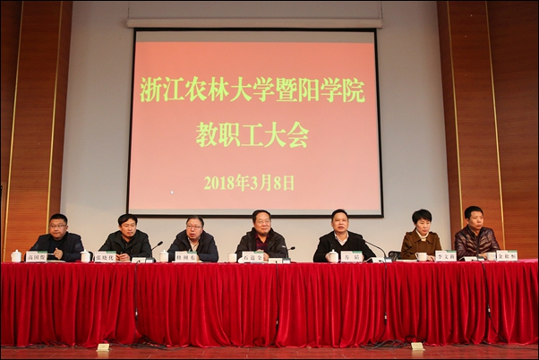 本网讯 3月8日下午,学院在明珠报告厅召开新学期全体教职工大会,传达学校中层干部扩大会议精神,表彰2017年度考核先进,对2018年工作进行再动员、再布置。学院党政领导石道金、修树东、李文莉、张晓优、金松恒、高国俊出席会议。党委书记寿韬主持会议。