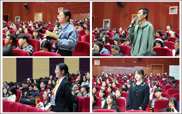 在交流互动环节,同学们围绕大学期间的专业学习、校园活动、实习实践、人际交往、恋爱情感等方面,以及考研、考公、考事业单位等就业方向选择方面提出了内心的疑问和困惑,校友们耐心细致地一一作了解答,并有针对性的提出了意见和建议。活动的最后,四位校友为母校60周年校庆献上真挚的祝福,为母校师生送上美好的祝愿。