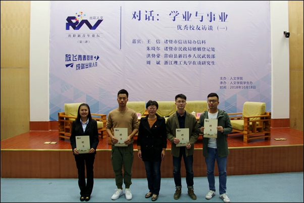 刘伯茹代表人文学院对校友们抽空参加出彩新青年论坛表示感谢,希望校友们常回母校看看,一如既往地关心、支持学院的发展,并为四位校友颁发了“出彩新青年论坛特聘讲师”聘书。