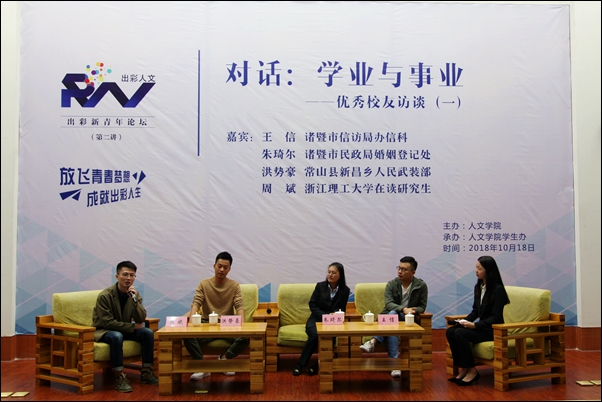 人文学院院长刘伯茹,诸暨市信访局办信科、城市管理051班优秀校友王信,诸暨市民政局婚姻登记处、公共事业管理111班优秀校友朱琦尔,常山县新昌乡人民武装部、城市管理121班优秀校友洪势豪,浙江理工大学在读研究生、英语131班优秀校友周斌出席论坛,学工办主任,全体辅导员,团学学生干部、各年级学生代表230余人参加活动。