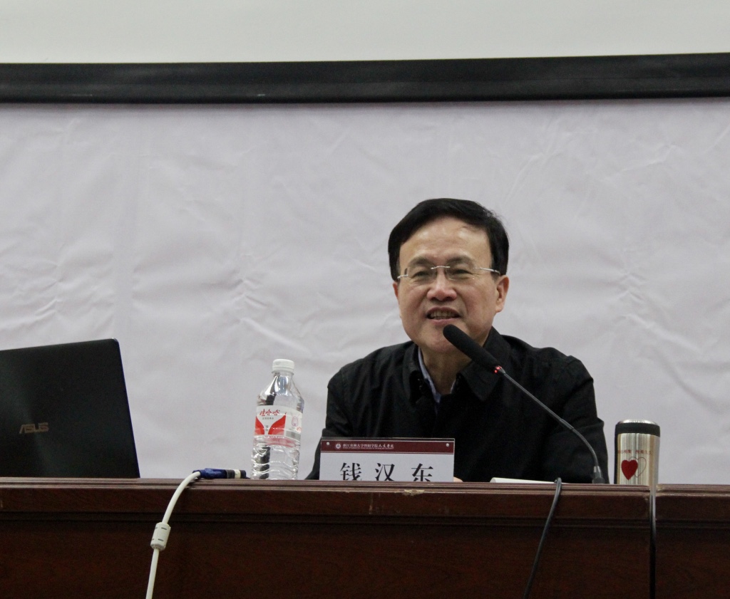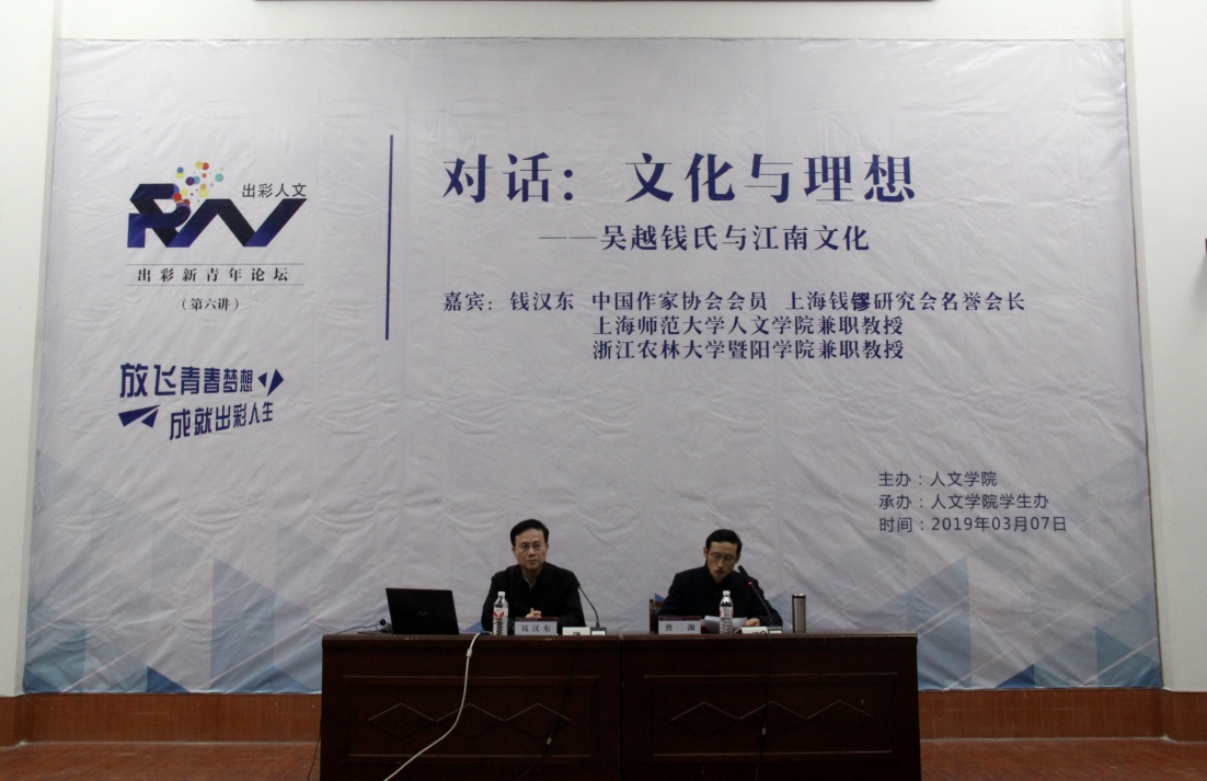 历史涌流,吴越江南涵韵古今;心潮澎湃,暨阳诸暨引领出彩。2019年3月7日下午两点,中国作家协会会员、上海钱鏐研究会名誉会长、上海师范大学人文学院兼职教授、bat365在线中国官网登录入口兼职教授钱汉东作客论坛,畅谈传统文化与家国命运的联系。bat365在线中国官网登录入口党委副书记高国俊,人文学院院长刘伯茹、学生办主任、全院师生代表200余人出席此次论坛,活动由人文学院党总支书记曹渊主持。