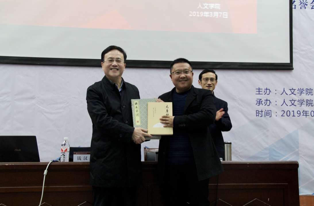 论坛以一场捐赠仪式拉开序幕,钱汉东教授将著作《大唐神韵》和《钱氏家训》赠与bat365在线中国官网登录入口,由高国俊书记接受赠书;捐赠书画作品《兰花图》予人文学院,由刘伯茹院长接受赠图。钱汉东教授特为我校创作《兰花图》并附诗,当场解读含义,寄愿我校“突破寒光”、“金兰飘香”、“初心依旧”、“自在寒芳”。随后,钱汉东教授对吴越钱氏与江南文化进行了深度演讲,钱教授畅谈诸暨,他谈及诸暨的抗战历史,歌颂诸暨民风悍勇,赞誉诸暨人侠肝义胆,赞美江南美丽风光,颂扬江南水乡文化在民族革命进程中发挥的巨大作用,言语间充分展现了自己身为诸暨人的骄傲。钱汉东与同学们共同解读《钱氏家训》,以亲身经历向同学们传递其中的内涵与价值,使在座的同学们受益匪浅。