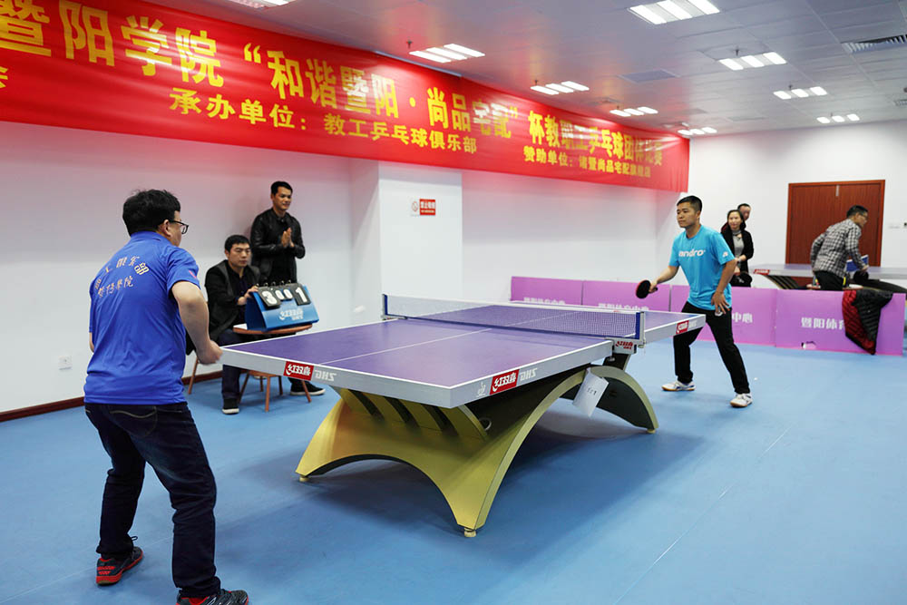 本网讯 4月10日下午,体育中心网球馆二楼乒乓球室欢声笑语,掌声呐喊声此起彼伏,热闹非凡。学院第一届教职工乒乓球团体比赛决赛正在体育馆精彩上演。