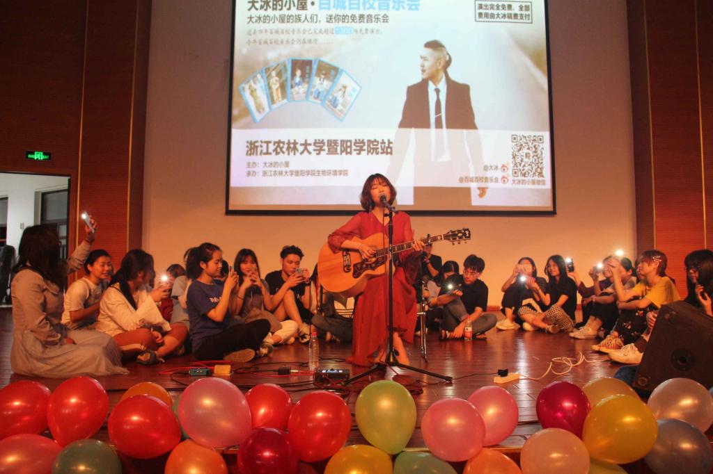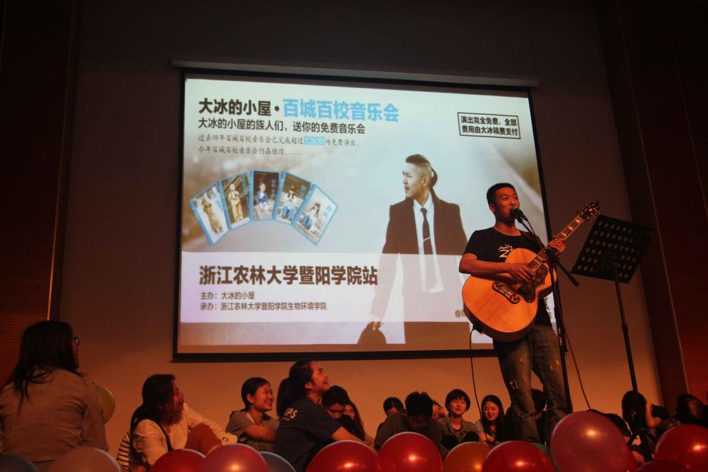 4月25日晚,“大冰的小屋·百城百校音乐会——暨阳站”在我院明珠报告厅举行。大冰,著名畅销书作家,电视台主持人,歌手。为了回馈他的读者们,大冰和他的朋友们在全国每个省份各个高校开展百城百校音乐会。此次暨阳站音乐会是学校里的读者们和大冰的小屋一次良好的互动。该音乐会吸引了全院师生的目光,活动当晚,现场气氛热烈,全场座无虚席,部分没有座位的观众甚至坐在舞台上和阶梯上,师生反映良好。