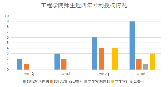 自实施“专利工程”以来,工程全体师生以培养学生的创新精神、创业能力、实践动手能力和锤炼综合素质为重点,在实践中培养学生敢于冒险、乐于创新、勇于实践的校园创业文化意识,在探索中增强师生知识产权保护能力。2015年以来,我院获得专利数量、质量均稳步提升,2017年专利授权达到两位数,2018年我院学生申报专利32项,师生获得授权专利15项,其中学生获得发明专利1项,实现了学生发明专利授权零的突破。“专利工程”得到有效推进,师生知识产权保护意识得到显著增强。