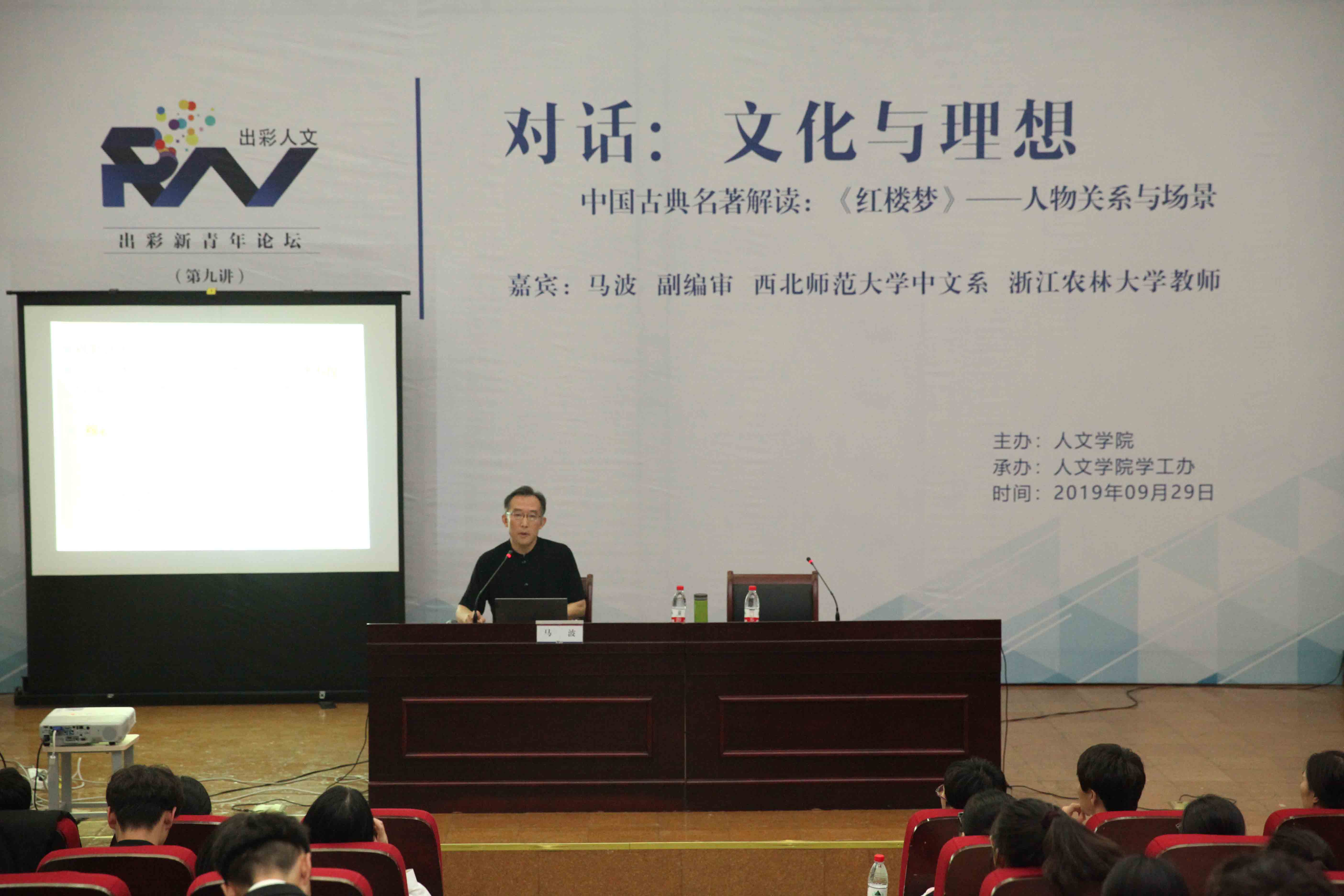 放飞青春梦想,成就出彩人生。9月29日晚,人文学院在人文楼4110举行了出彩新青年论坛第九讲。副编审、西北师范大学中文系、bat365在线中国官网登录入口教师马波老师作客论坛,与我们分享了他对中国四大名著之一《红楼梦》的人物关系场景的解读。人文学院院长刘伯茹、党总支书记宣王威、学生办全体辅导员、人文学院团学学生干部、2019级新生等250余人出席本次论坛。