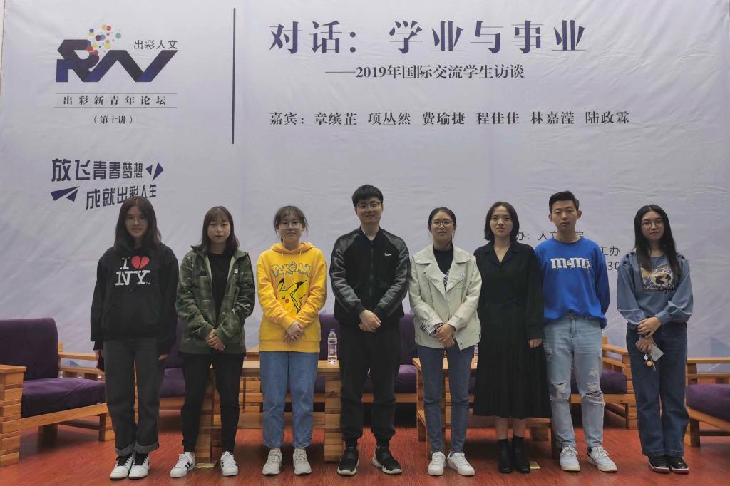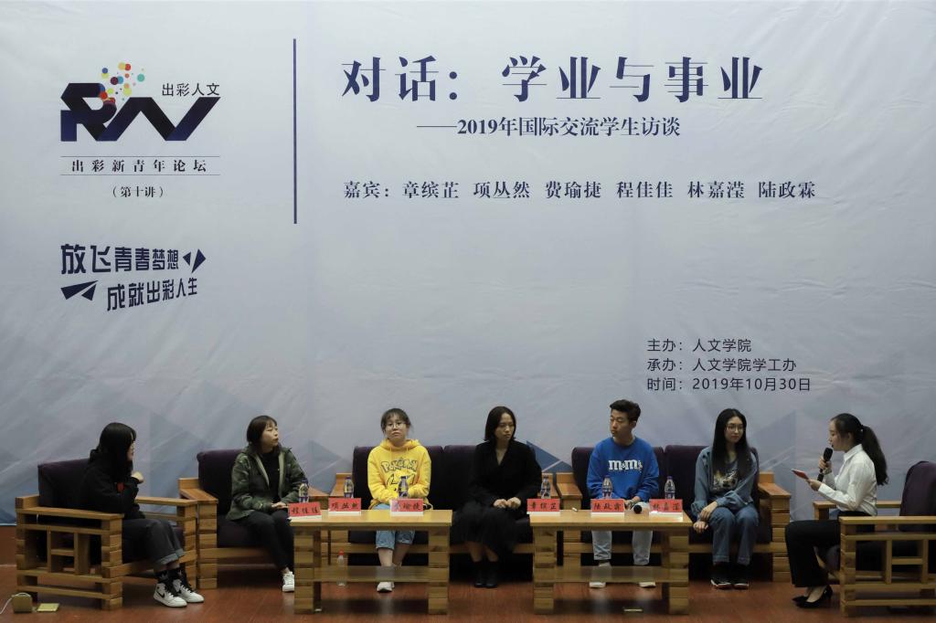 10月30日晚七点,人文学院在图书馆报告厅举办了出彩新青年第十讲,对话:学业与事业——2019年国际交流学生访谈。此讲邀请了游学归来的学生嘉宾做客论坛,共话学业规划和事业生涯。