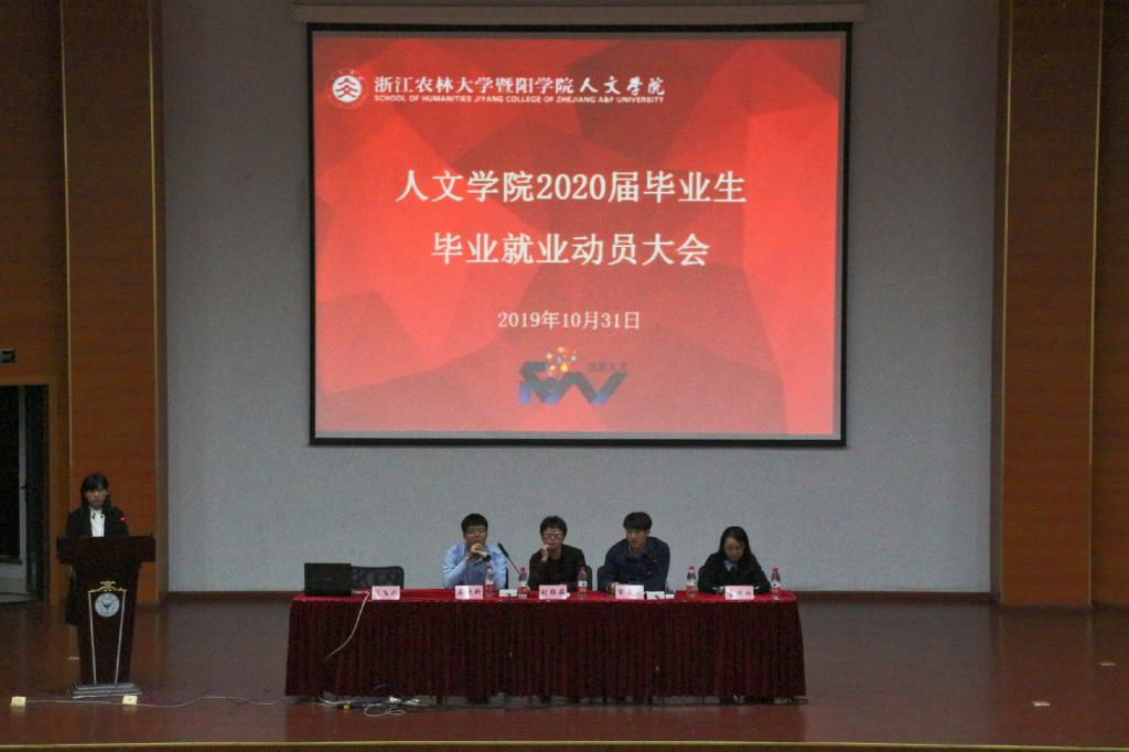 10月31日晚,人文学院2020届毕业生就业动员大会在明珠报告厅举行。院长刘伯茹、党总支书记宣王威、学生办主任石杭科、教学秘书童丽珏、毕业班辅导员陈飞彩以及全体2020届毕业生参与会议。大会由毕业班辅导员陈飞彩主持。