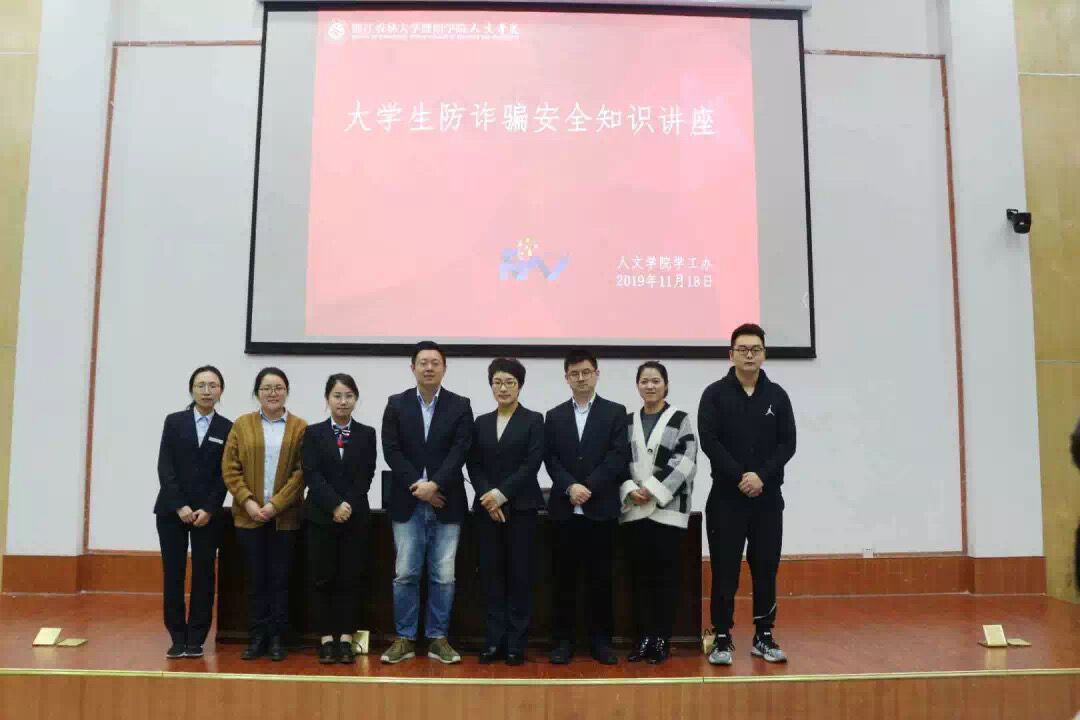 针对近年来大学生群体面对各类诈骗案件时防范意识差、辨识能力弱、应对水平低的现象,bat365在线中国官网登录入口人文学院于2019年11月18日晚六点,在图书馆报告厅开展了大学生防诈骗安全知识讲座。讲座邀请了中国邮政储蓄银行个人金融部经理楼俞妤,大唐支行行长王成侃,枫桥镇支行行长赵科,综合管理部经理陈震旦以及两位资深理财经理,三位综合柜员作为嘉宾。人文学院院长刘伯茹,党总支书记宣王威,学工办全体辅导员,团学学生干部及2019级学生等250余人出席本次讲座。