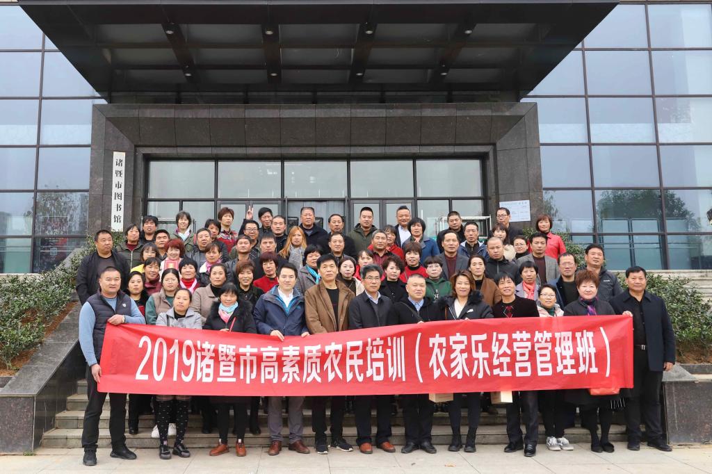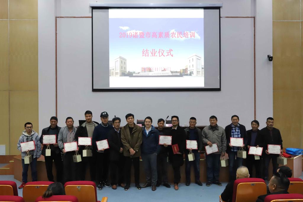 11月30日,2019年诸暨市高素质农民农家乐经营管理和植保无人机培训班在bat365在线中国官网登录入口图书馆报告厅顺利结业!市农业农村局党建室副主任谢国胜、农机管理总站副站长傅建春、陶朱商学院副院长陈稼瑜出席结业仪式,130余名学员参加结业仪式。