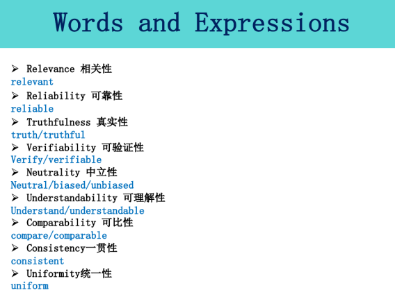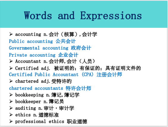 ü 第一个环节:words and expressions(单词和词组)。针对单元里面需要重点掌握的专业英文词汇进行讲解,带领学生一起学习和朗读,为后续重点学习内容的展开扫清词汇障碍,也方便学生在课后根据课件内容进行词汇的整理和复习。