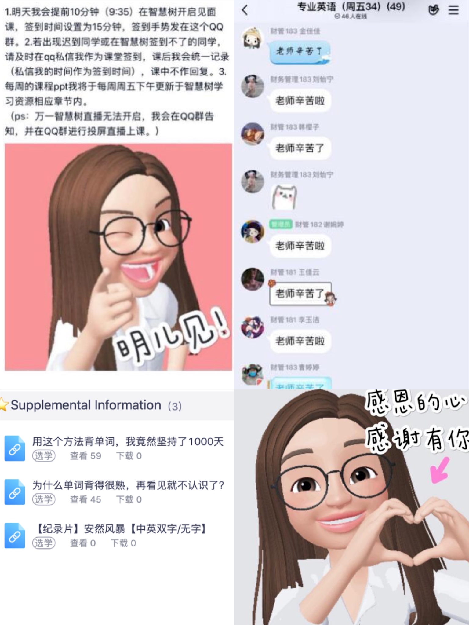 由于网络教学的特殊性,无法直观地去考察课堂情况,所以陈老师在每个教学班级安排了一名课代表在每一周的课后搜集同学们的对课堂的建议。第二周,根据网上课堂情况和同学们提出的建议,课堂安排的调整会提前一天在课程QQ群进行公告,以保证网上课堂的效率。此外,课后,除了课程相应的课件,还会在平台上补充分享一些有趣的英语和财务学习的资源。