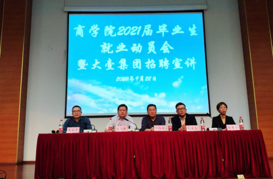 为切实做好2021届毕业生就业工作,实现毕业生充分高质量就业,9月22日,商学院在明珠报告厅召开了学生就业工作动员会。院长何红光、党总支书记潘小承、党总支副书记季永亮、院系相关教师、商学院2021届全体毕业生以及大壹新零售集团有限公司齐云飞、金君君等公司主要负责人员共同出席了本次就业动员大会。